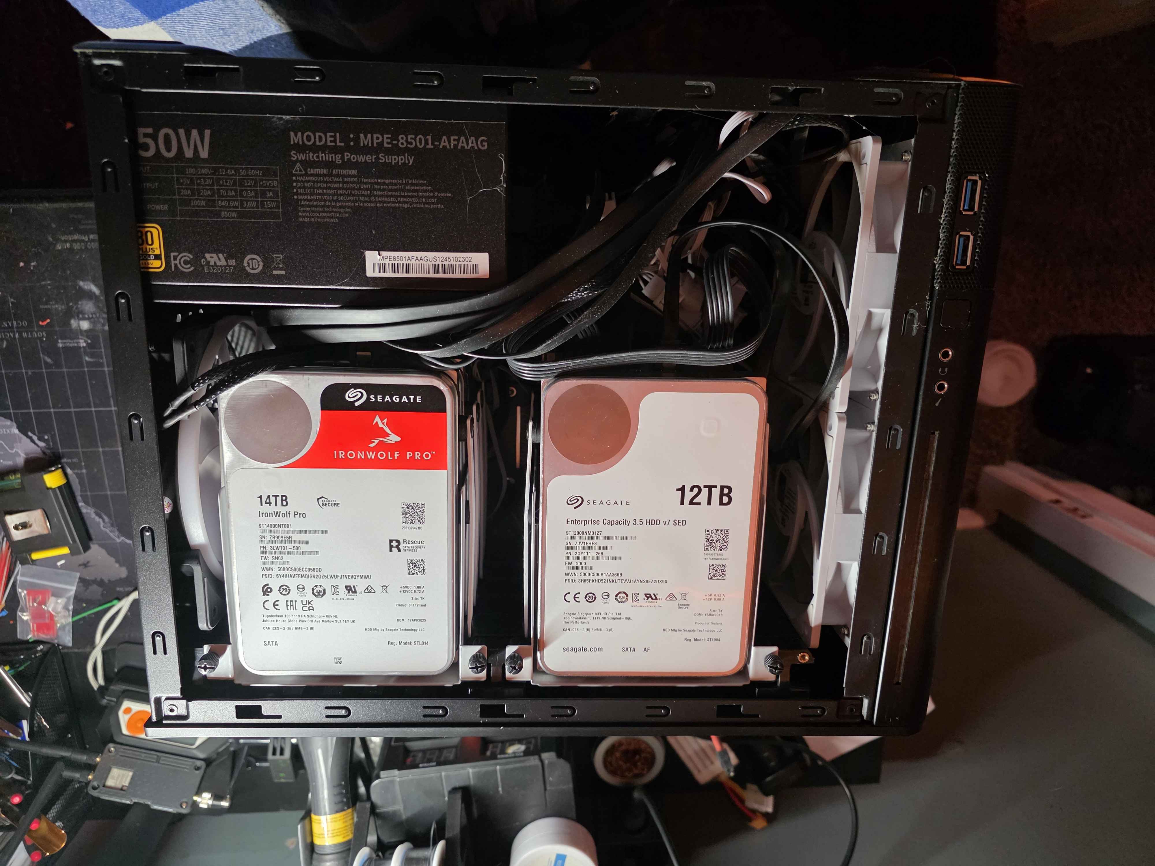 Older 12 TB Seagate Exos drives are not currently in production use; one drive has failed, and the remaining disk is retained only for testing and performance evaluation. This keeps the active lab environment focused on stable, known-good storage hardware.
